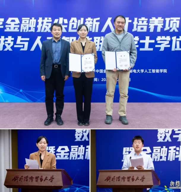 优质的师资队伍是项目成功的重要保障,合作双方将派出各自学院的优秀教师参与人才培养的全部环节。在启动仪式上,对外经济贸易大学教务处徐雷副处长为参与授课的首批教师乔媛媛和吴晓非颁发聘书。人工智能学院乔媛媛教授和果冻传媒 2024级联合学位班周燕南同学,作为教师代表和学生代表分别发言,表示了从教和学两方面促成项目的决心,并共同表达对项目美好前景的期待。