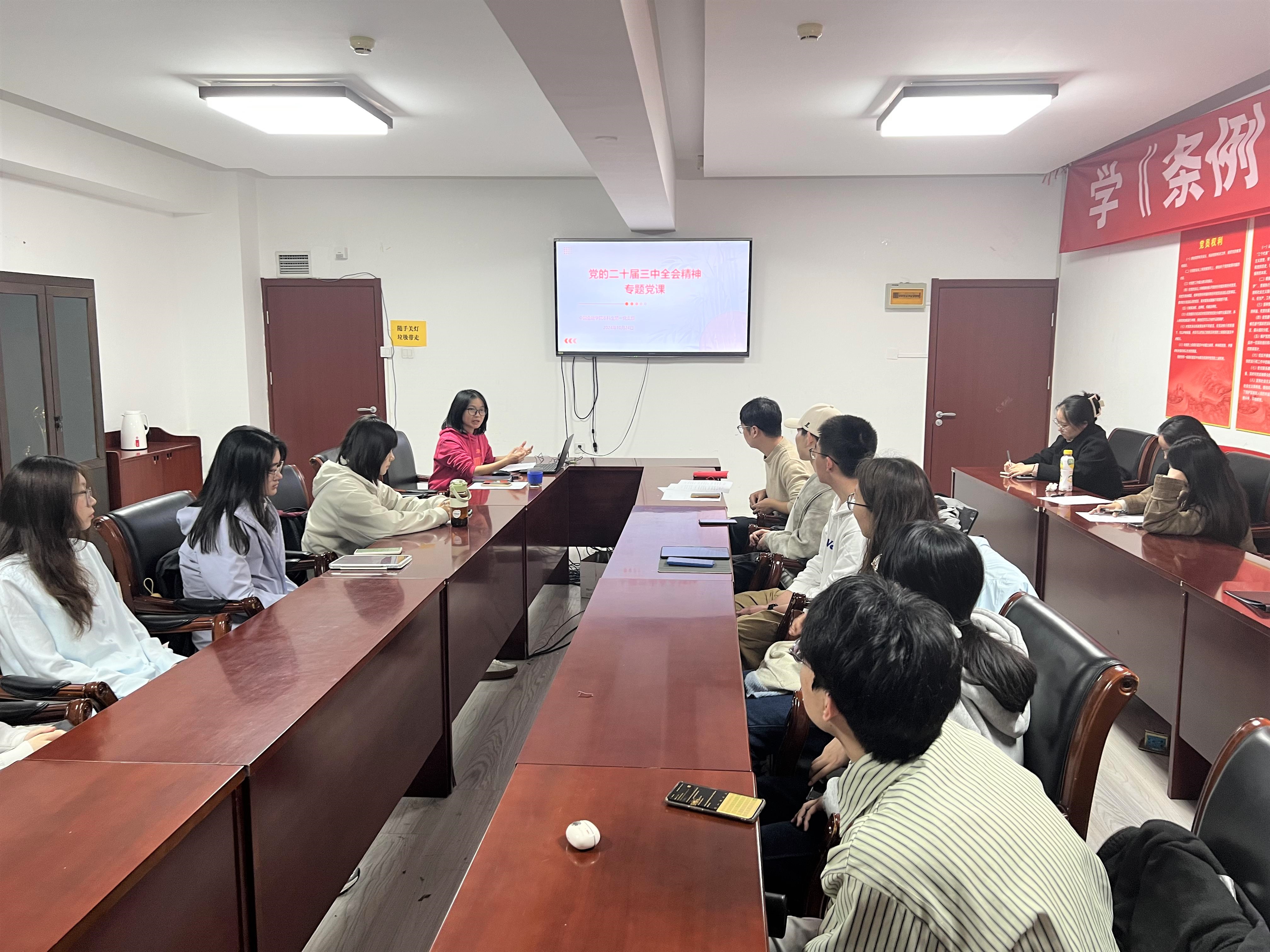 首先由党支部书记陈玉平老师讲授专题党课,带领大家学习二十届三中全会精神,从深刻领会进一步全面深化改革的重要性和必要性、准确把握进一步全面深化改革的总体要求和重大原则、全面准确理解决定提出的进一步全面深化改革的重大举措理解、以钉钉子精神全面抓好全会任务的贯彻落实四个方面带领师生党员学习全会内容,并通过“高校学生党员有何为?”引导大家思考党员的责任。会议强调,学习好贯彻好党的二十届三中全会精神,是当前和今后一个时期全党全国的一项重大政治任务,党支部全体成员要深入学习领会全会精神,在学习领会中深刻领悟“两个确立”的决定性意义,不断增强坚决践行“两个维护”的政治自觉、思想自觉、行动自觉。