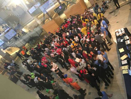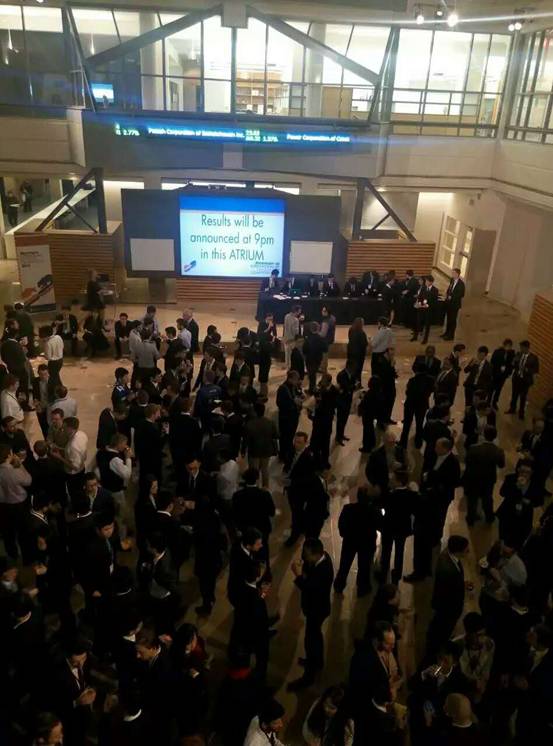 下图为场内公开喊价中交易员角色的队员所在的Fleck Atrium。锣声一响,所有交易员都沸腾了,拿着交易票在场内疾走着,高呼着。场内公开喊价是第一次见面的破冰环节,也是为了之后真正比宏观经济场内公开喊价做的热身。