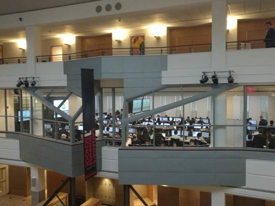 在比赛过程中,选手面临着诸多挑战。RITC大赛中使用的日历日期和交易日期不同,比如16分钟的交易时间就能代表两个月的日历时间。每个题目需要进行两场及以上,没有主观评分,也无路演或拉票,最终都以确切的损益进行排名。其中销售交易和算法交易的决赛都在大屏幕上实时播报战况,紧张程度溢于言表。下图为比赛场地之一Rotman Finance Lab。当有队友进去比赛的时候,其他人要么在Event Hall里继续紧锣密鼓地讨论着下一场比赛,要么站在实验室外面焦虑地张望和祈祷。