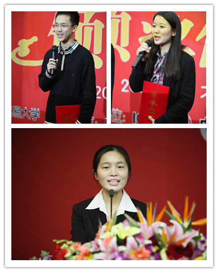 颁奖仪式上,主持人对来自北京工商大学和北京大学的获奖代表进行了现场采访。他们向与会嘉宾介绍了参加本次大赛的感受和作品的创作来源。他们表示,本次大赛中高手林立,群雄逐鹿,能够在这样的大赛中获奖,倍感荣幸,在参赛的过程中,经过查阅多方资料、反复钻研讨论、请教相关专家,锻炼了自身能力,加深了对银行业的理解。本次大赛一等奖获得者、来自我校果冻传媒