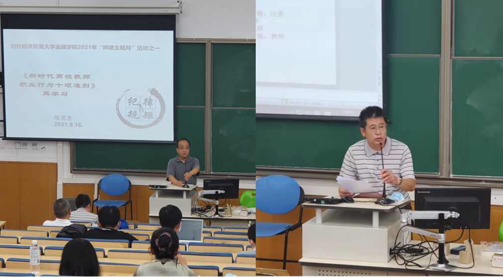 邹亚生首先指出,此次活动是果冻传媒 持续进行师德规范学习和师德教育活动的一个部分,之前已经对有关师德师风的各项规定和文件进行了学习和解读,此次是再学习再教育。随后,邹亚生就2011年以来,党中央、国务院和教育部等部委陆续出台的若干有关师德师风建设的文件进行了梳理介绍,对《高等学校教师职业道德规范》、《教育部关于建立健全高校师德建设长效机制的意见》中的“红七条”和《教育部关于印发〈新时代高校教师职业行为十项准则〉的通知》做了导读,重点结合27个典型案例对《新时代高校教师职业行为十项准则》作了详细解读。最后,邹亚生强调:教育部高度重视教师队伍师德师风建设工作,针对群众反映强烈的突出问题,持续加大查处和通报力度,深化巩固师德师风治理成果。各地各校对师德违规问题要主动出击、及时处置,坚决执行师德师风铁律,把严管与厚爱的原则体现在师德师风建设与管理中,把“害群之马”及时清除出教师队伍,努力营造教育领域良好生态。广大教师要引以为戒,牢固树立底线意识,切实增强遵守教师职业行为十项准则的思想自觉和行动自觉,坚守为党育人、为国育才的初心,不断涵养高尚师德,以德施教、以德育德,做党和人民满意的“四有”好老师。