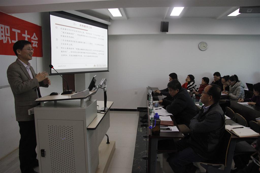 大会第一项内容是吴卫星院长代表学院领导班子做2015年工作报告。吴院长从领导班子建设、学科建设、本科教学工作、研究生教育、科研工作、国际交流、党务行政工会校友、社会服务八个方面全面汇报了2015年学院取得的成绩,指出了需要继续努力的方向,提出了2016年的工作目标。吴院长的汇报数据翔实、提纲挈领,让全院教职工对过去一年学院的发展情况有了全面清晰的了解,对2016年的工作有了明确目标。