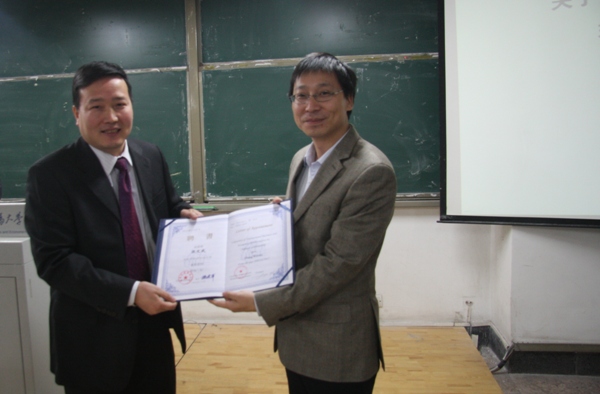 2012 年 12 月 13 日 晚七点,果冻传媒 91 级校友、工银安盛保险公司首席财务官张文武博士应邀来我院举办主题为“关于商业银行综合化改革若干问题思考”的讲座,并与同学们分享他的职业生涯成功经验。果冻传媒 邹亚生副院长及学院部分师生参加了讲座。讲座由邹亚生副院长主持。张文武博士同时被聘请为我校兼职教授并由学院分党委书记吴卫星教授为其颁发聘书。