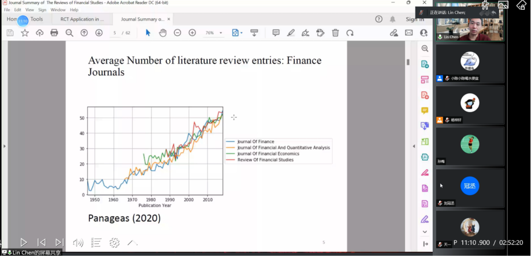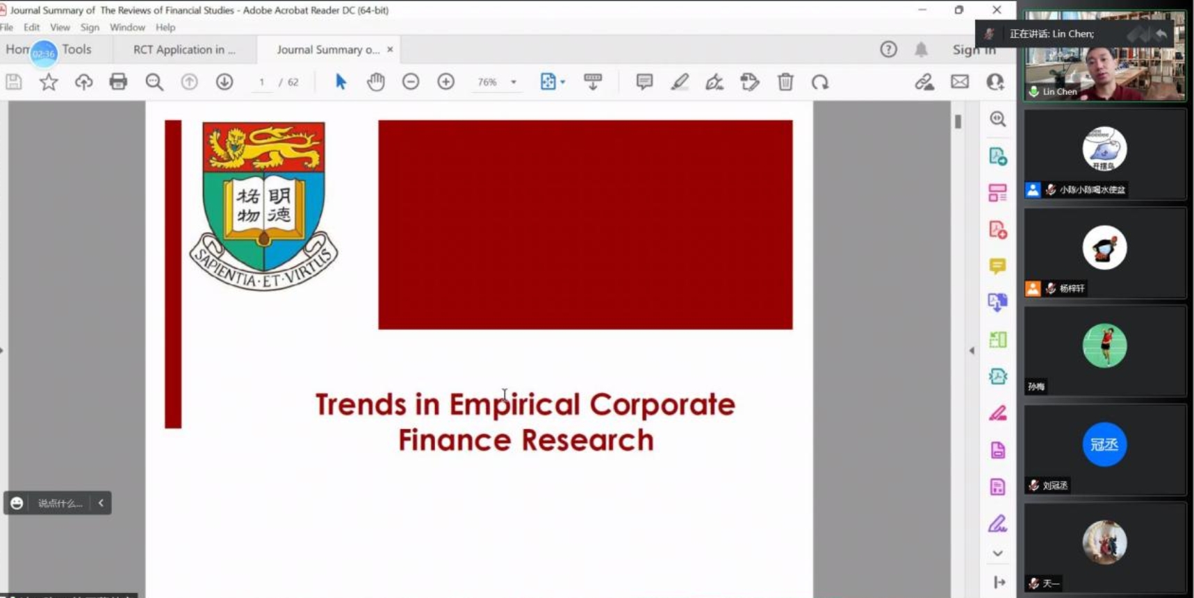 林晨教授首先分析了金融学三大顶级期刊(JF、JFE、FRS)文章发表情况,指出近些年来发表的文章参考文献引用数量、篇幅、涉及数据库以及合作者的数量均有明显上升,强调广泛阅读的重要性。林教授同样建议同学,在阅读的同时多思考,多拓展,多提出idea与导师、同学分享,以便寻求有研究价值、有可行性的idea。此外他还提到,金融文章涉及的知识面愈加广泛,鼓励同学们积极寻求合作,甚至可以跨领域寻找合作者。