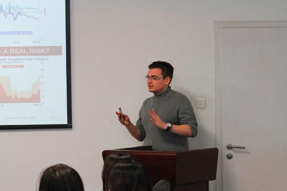 接下来,列支敦士登大学的MBA研究生以“欧元区、欧元的现状与远景”为题进行了展示。他介绍了欧元的历史进程、运行机制、汇率决定因素等内容,并结合2011年的欧债危机发表了自己的观点。之后,我院同学就欧债危机的应对策略、欧元区财政政策统一的可能性、欧元量化宽松政策等问题与对方师生进行了热烈的讨论,来自不同国家的学生分别从自己国家的角度讲述了对欧元的观点和看法。