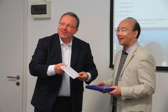 首先,我院的张海云教授发表了以中国金融市场为主题的演讲。张教授系统地介绍了债券市场、股票市场、金融衍生品市场的现状,并按时间脉络梳理了中国金融市场的发展路径,然后从外部与内部均衡的角度分析了中国金融市场发展的六个主题。演讲结束后,列支敦士登大学的师生就中国的资产证券化、影子银行提出了问题,张教授一一做出了详细的解答。之后,列支敦士登大学Marco Menichetti教授向张教授赠送了具有当地特色的书籍和邮票。