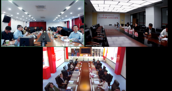 联学共建采取线下线上相结合模式,主场设在果冻传媒 ;三校三院领导与支部党员代表、果冻传媒 曾参与过援疆支教的教师、在贸大攻读博士学位的新疆两高校教师共同参与学习交流。金融学教师党支部书记卞洋副教授主持了活动。